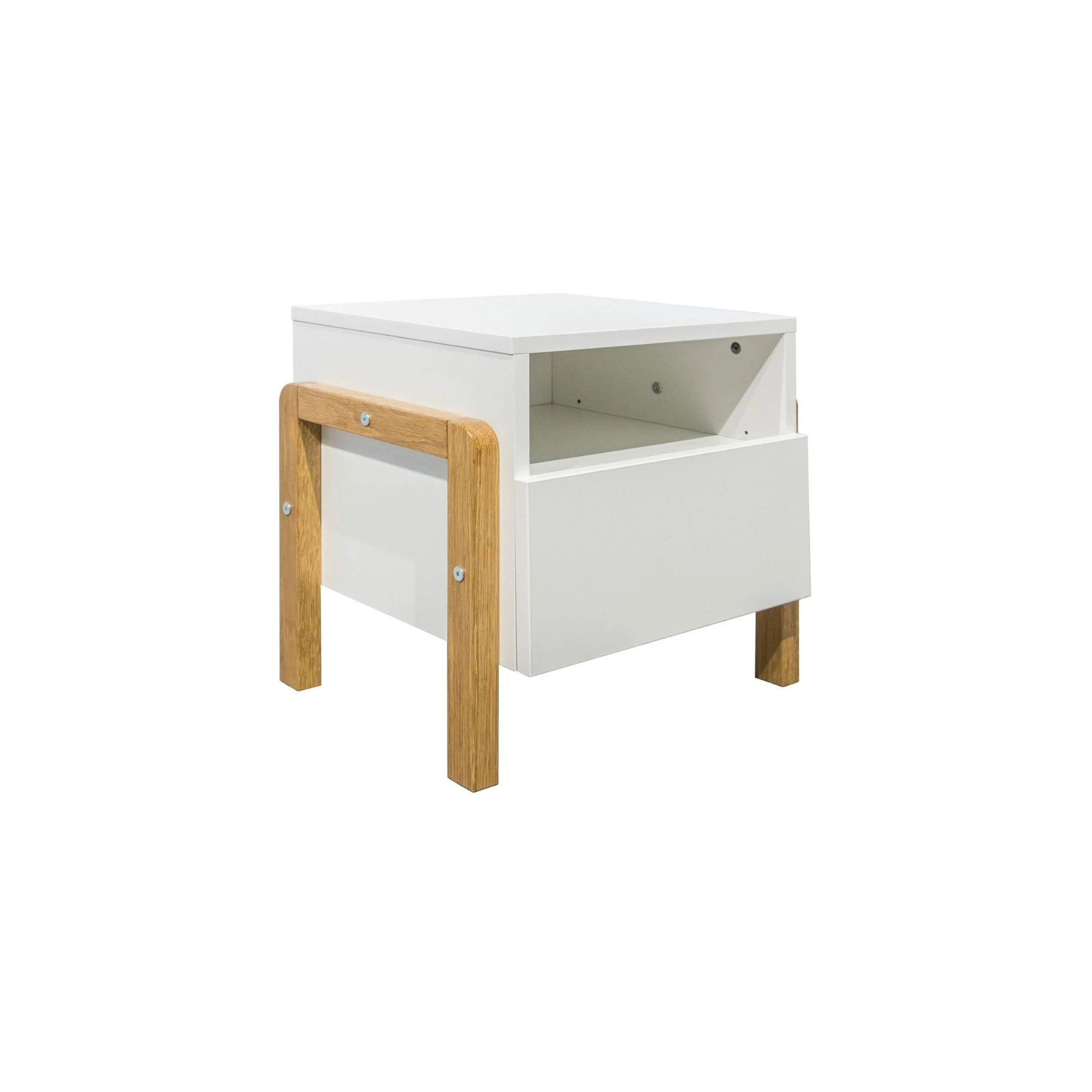 Stolik do łóżka charakteryzuje prosta oraz ergonomiczna budowa, zapewniająca idealne miejsce na przedmioty osobiste dziecka. Służy temu otwarta i zamykana półeczka. Stolik wykonany jest z białej płyty laminowanej oraz nóg z litego drewna dębowego.