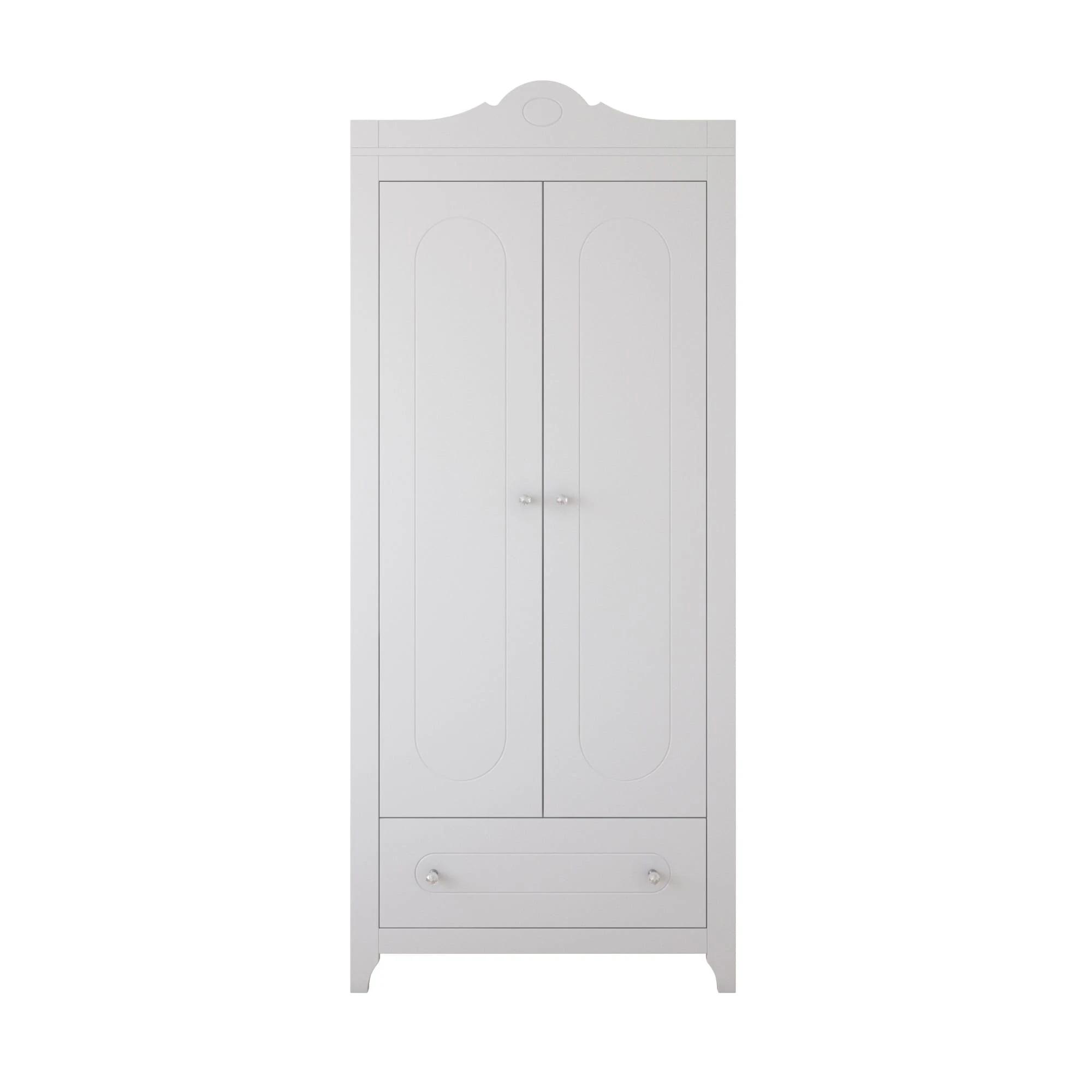 Szafa Glamour to część wyjątkowej kolekcji mebli dziecięcych Glamour, w której znajdziesz także komodę Glamour, regał Glamour oraz łóżeczko Glamour. Wszystkie elementy łączy biały kolor, frezowane fronty i kryształowe uchwyty, tworząc spójny komplet do pokoju dziewczynki urządzonego w eleganckim stylu glamour.