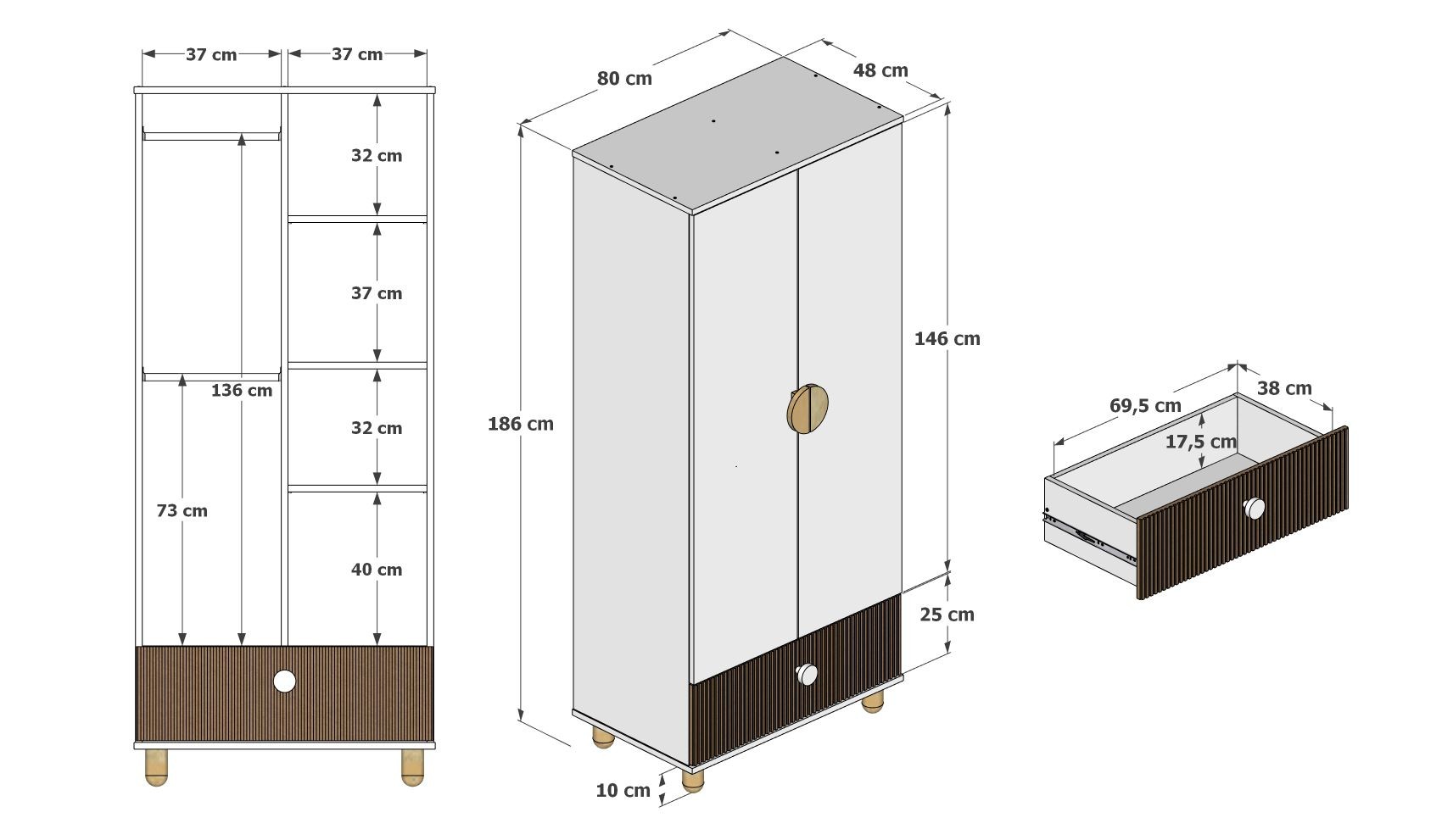 Wymiary: wys. 186 cm / szer. 80 cm / gł. 48 cm