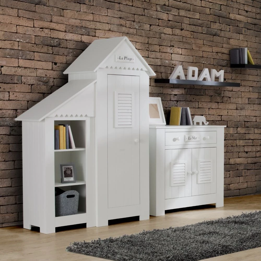 Charakterystyczny daszek i frezowane elementy nawiązują do mebli domków, które wprowadzają do pokoju dziecka przyjemną, bajkową atmosferę.