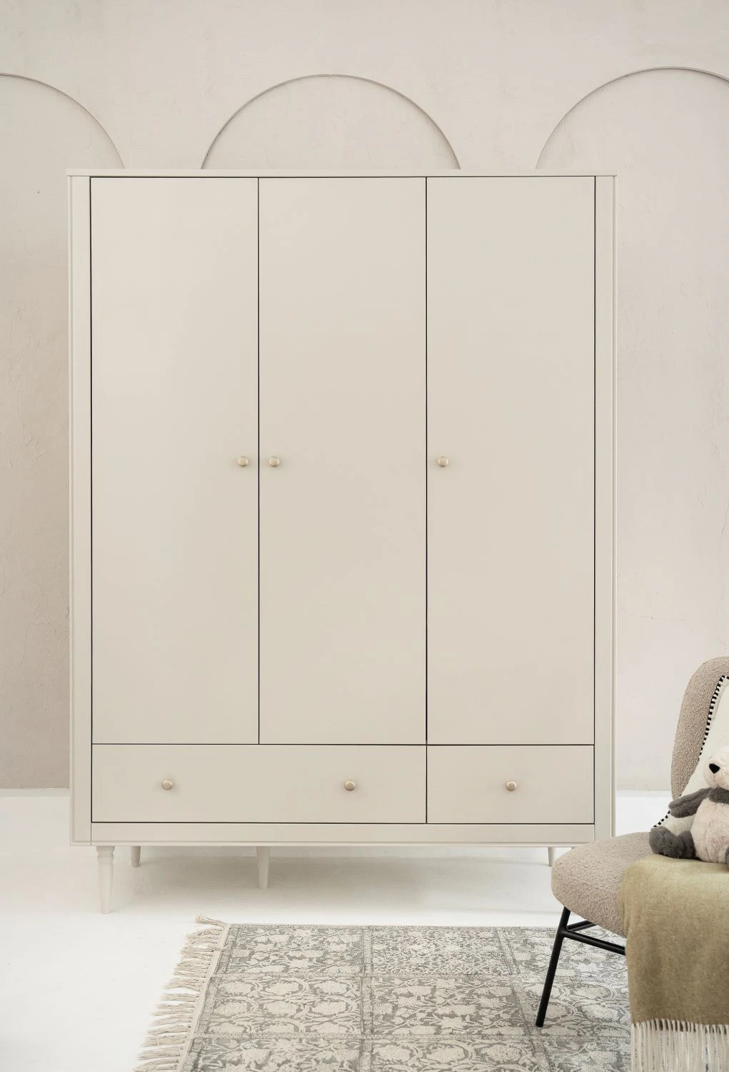 Szafa trzydrzwiowa Petite to największy model z kolekcji mebli dziecięcych Petite, zaprojektowany w klasycznym stylu i utrzymany w eleganckim kolorze szampańskim. Dzięki przemyślanej budowie zapewnia wiele miejsca do przechowywania ubrań, akcesoriów i tekstyliów, tworząc serce garderoby w pokoju dziecka.