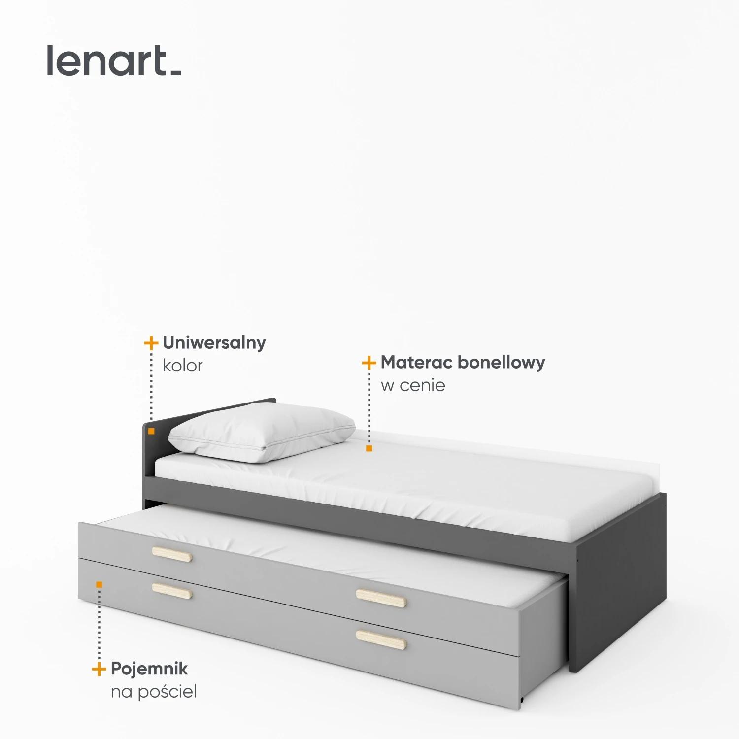 Dzięki sprytnemu podziałowi szuflada oferuje zarówno dodatkowe miejsce do spania, jak i praktyczny pojemnik na pościel. To rozwiązanie idealne do mniejszych pomieszczeń, w których ważne jest maksymalne wykorzystanie przestrzeni.