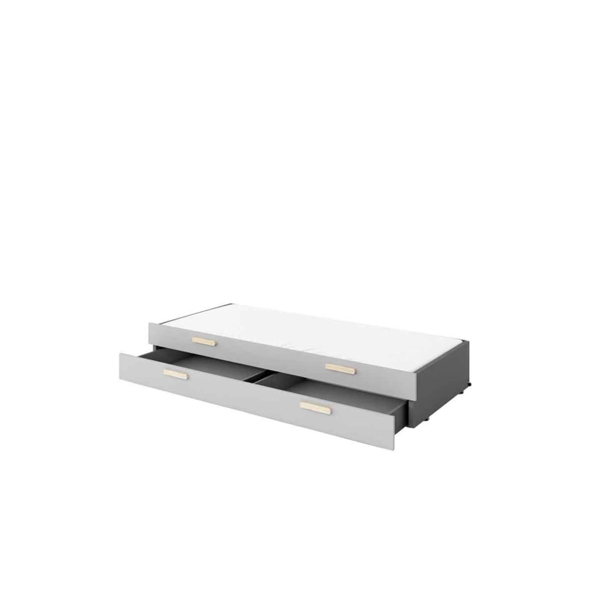 Front szuflady utrzymany jest w stylistyce kolekcji Pok – połączenie jasnej szarości, bieli i grafitu, uzupełnione drewnianymi uchwytami. Dzięki temu szuflada idealnie komponuje się z łóżkiem i pozostałymi meblami serii, tworząc spójną aranżację.
